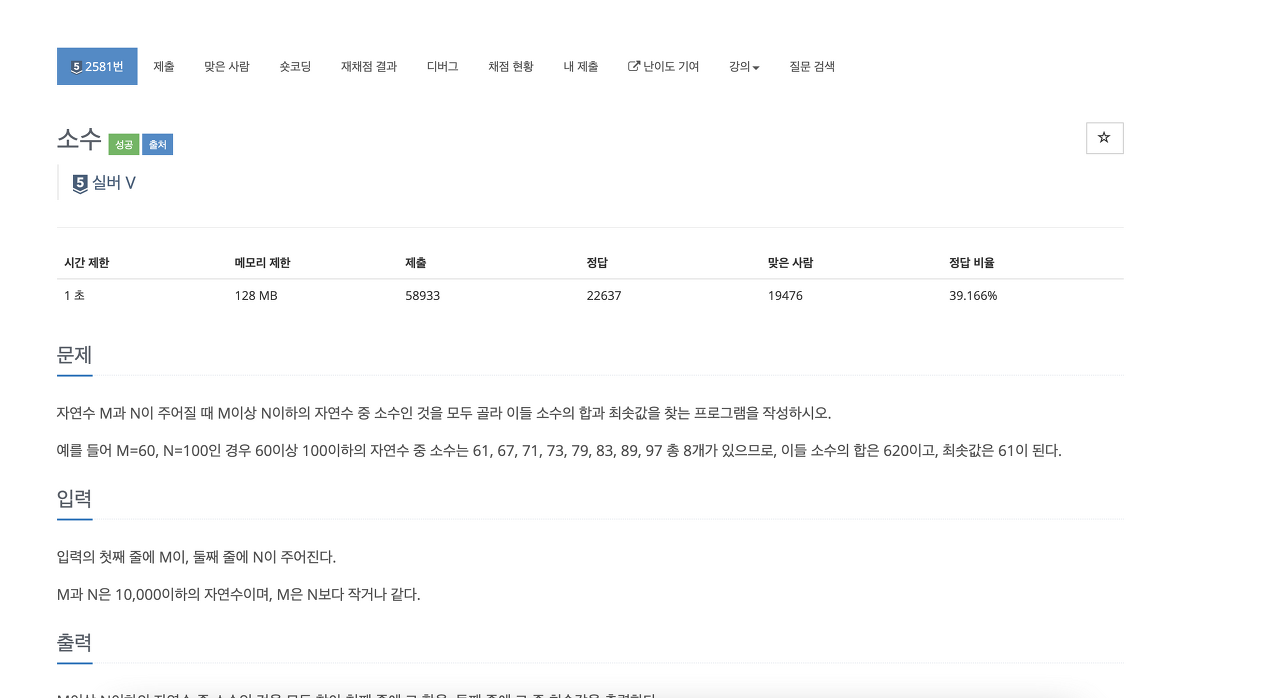 https://www.acmicpc.net/problem/2581 다양한 풀이가 있는 것 같아 내 것도 올려본다. 제곱근 소수가 아닌 N의 약수는 무조건 [1,N] 사이에 존재한다. 어떤 자연수 n이 소수인지 알기 위해서 제곱근 n까지만 진행하면 된다. 수가 수를 나누기 위해서 몫이 항상 필요하며 나누는 수와 몫 중 하나는 반드시 제곱근n 이하이기 때문이다. 나누는 수와 몫이 제곱근n을 좌우로 대칭이므로 제곱근값보다 같거나 작은 숫자로 나누어지면 그 이후는 계산을 할 필요가 없다. 때문에 계산이 간략해진다. 코드 #include #include using namespace std; using ll = long long; const int INF = 10001; int ans = 0; bool isPrim..
